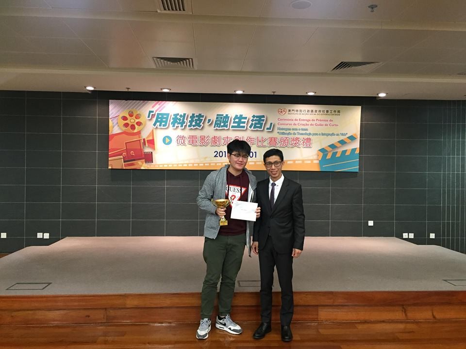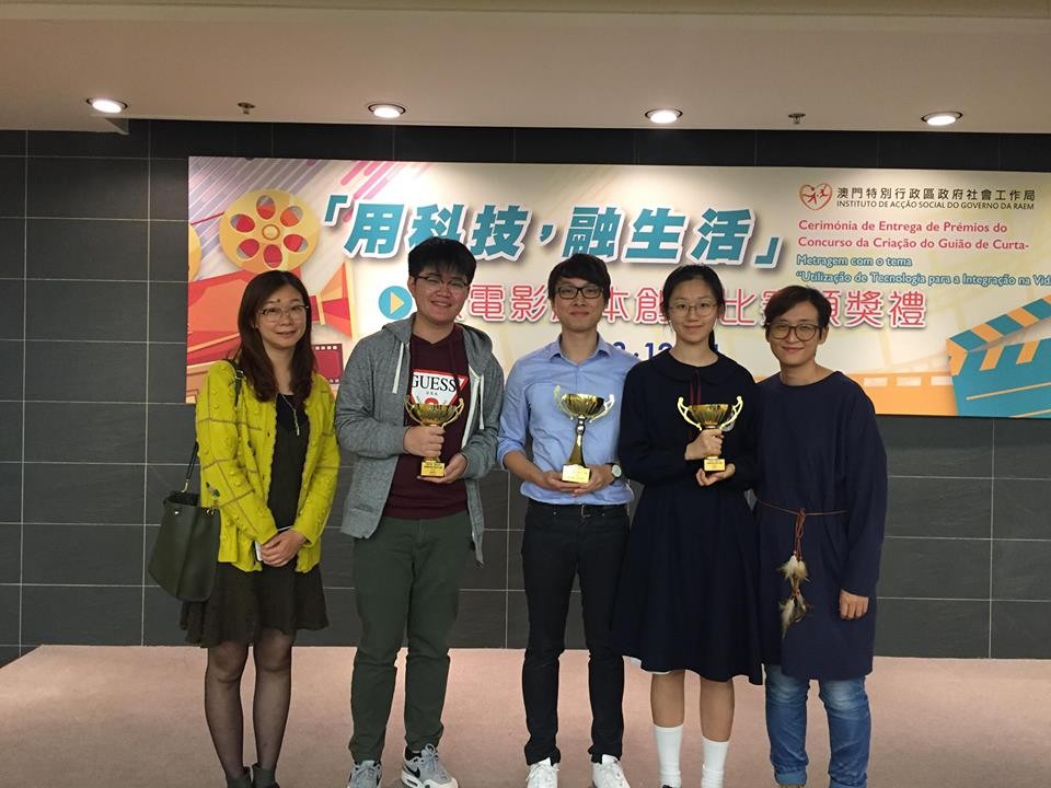 由社會工作局所舉辦的「用科技,融生活」微電影劇本創作比賽,12月1日下午於民政總處下環活動中心舉行頒獎禮。大會於是次比賽共收到42份作品,最後由本台導師黃耀鋒老師與本台台長高三信李瀚恩合力撰寫的劇本勇奪冠軍,此劇本以英國高中生Easton LaChappelle的真人真事進行改編。而高三正張灝鈞憑作品<<不再>>獲季軍,高三正吳雪怡憑作品<<形色>>獲優異獎,季軍及優異獎是由郭艷玲老師及戴碧筠老師共同指導。