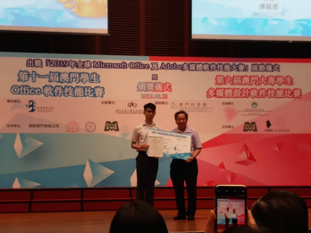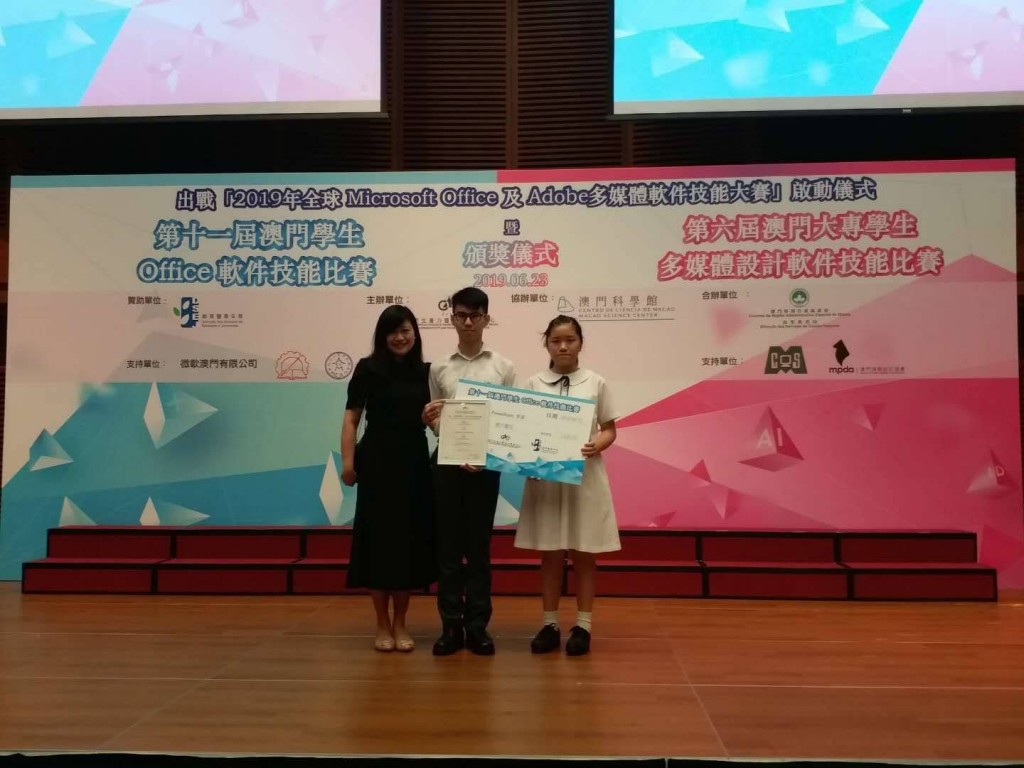 由澳門生產力科技轉移中心主辦第十一屆澳門學生office 軟件技能比賽中,高二級徐延忠同學榮獲PowerPoint項目季軍及Microsoft Office Specialist國際認證,高一級林籽然同學獲Microsoft Office Specialist 國際認證。