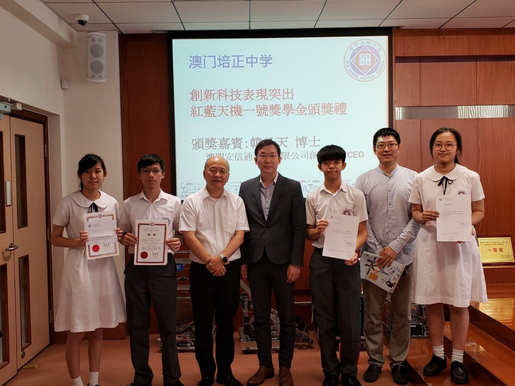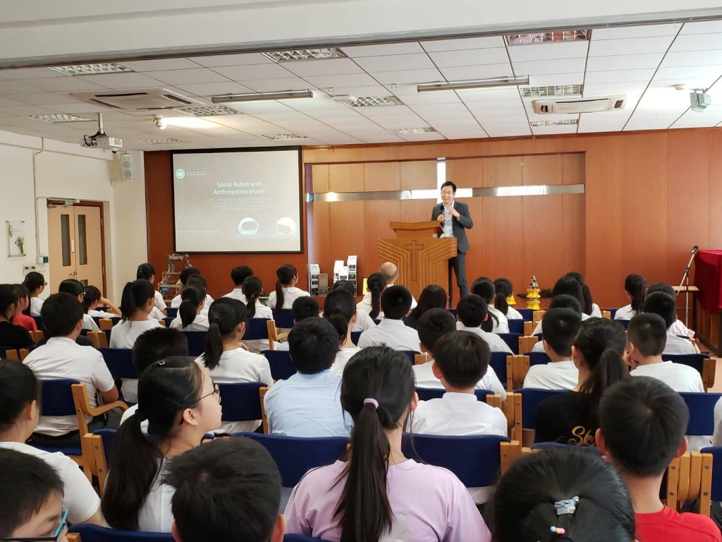澳門科技大學產學研公司-安信通科技有限公司創始人兼CEO韓子天博士今早蒞臨我校,為升初一暑期活動班同學主持科技講座,主講的題目是社交機器人與擬人化。韓教授團隊曾研發出天機一號服務機械人等,並致力於青少年機器人的教育,亦連續兩年為我校同學提供天機一號紅藍獎學金。講座開始前韓教授為今年我校獲獎同學頒獎,而獲獎同學亦同大家分享我校機器人團隊在設計與比賽中的經歷。