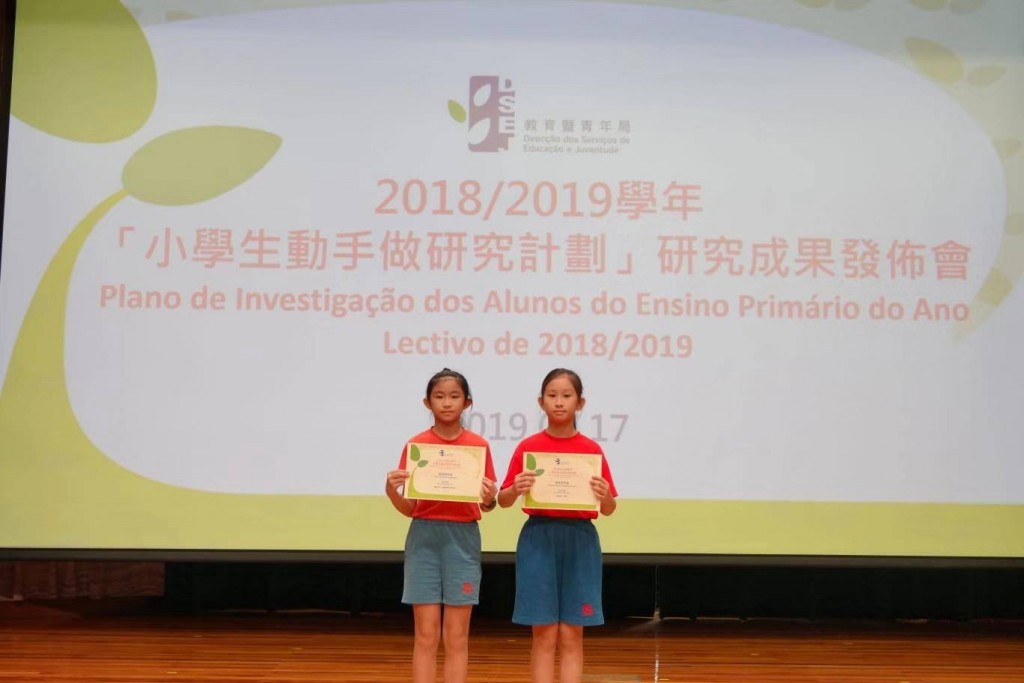 澳門教育暨青年局主辦,2018/2019學年「小學生動手做研究計劃」,本校小五六學生源卓穎、張善甯、宋林宣、崔天逸、黃寶瑩、布晞彤以其作品「智能何仔公製置製作及探究」獲得最佳研究獎。以上作品由郭振業及林潤薇老師共同指導。