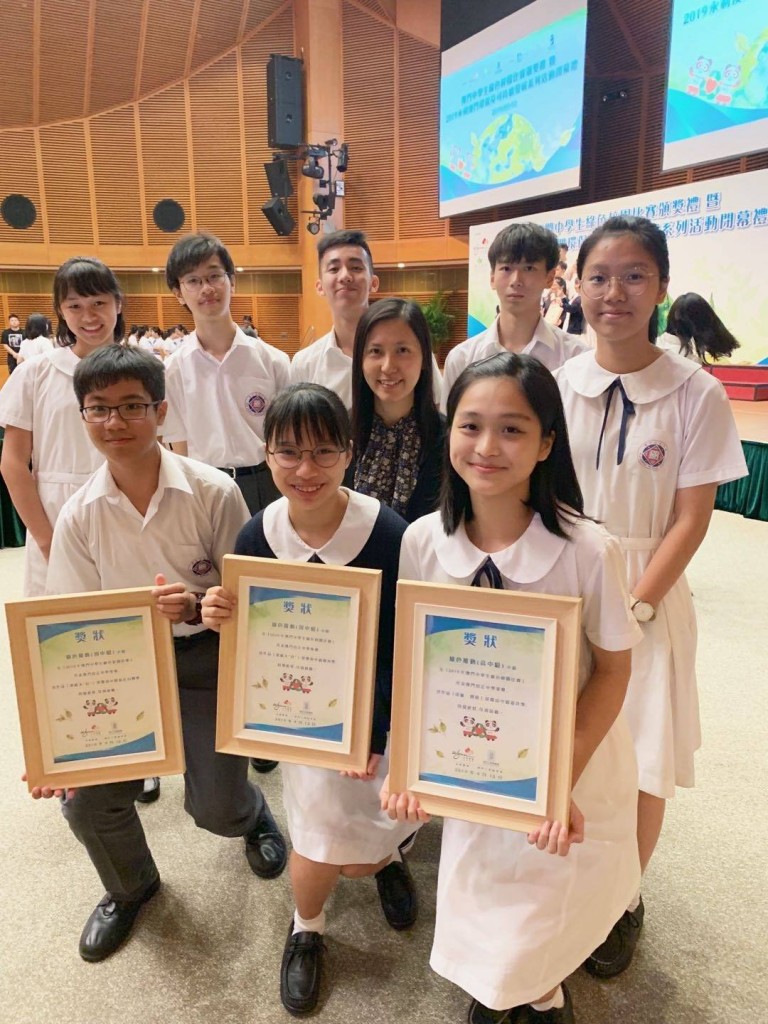 由澳門工程師學會與永利澳門有限公司合辦之澳門中學生綠色校園比賽,本校高樂夷、馬凝希、陳紀嵐、梁晉寧同學獲得高中組嘉許奬;朱雅祁、譚仲軒、梁浚希、黃海姚同學獲得初中組優秀奬。初中組更於現場向評審簡報自己作品,表現優異,獲頒最佳台風獎。