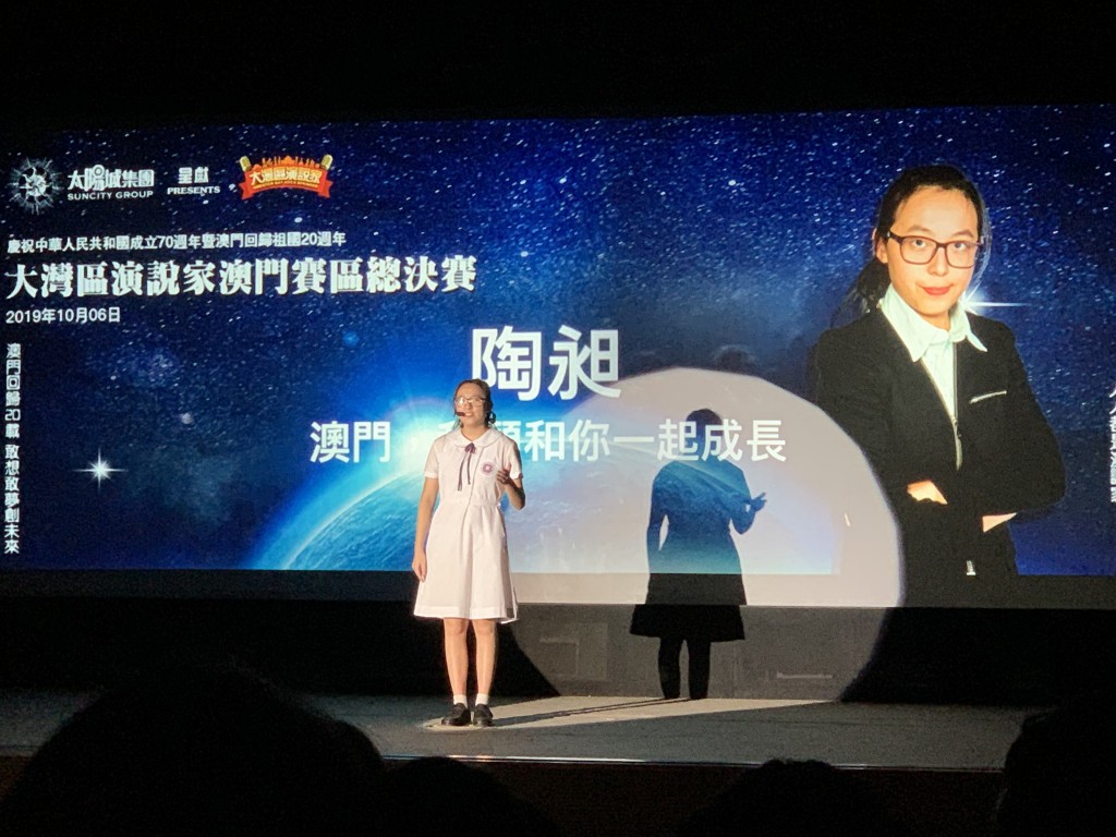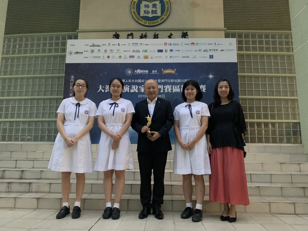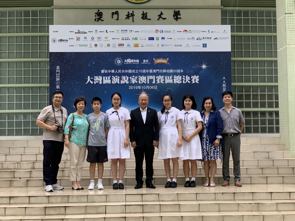 由澳門我是演講家協會、香港聯合出版集團、紫荊雜誌社及廣東新勵成教育股份有限公司主辦之大灣區演說家澳門區總決賽,今天下午假科技大學禮堂舉行,本校羅家瀠、鄺妍華、陶昶,成為進入總決賽青年組最後八強,他們出色表現獲評委的肯定,他們將於11月2日參加大灣區演說家總決賽,與來自大灣區的一百多位演說精英一同較量。本校獲主辦單位頒發最積極參與團體獎。