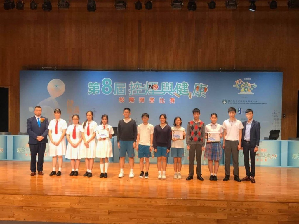 「第8屆控煙與健康校際問答比賽」今天舉行,來自本澳及大灣區二十多間學校共56支隊伍參加。經過激烈的比賽,本校迎難而上隊伍(林碧怡、梁雅姿、區柏豪、張証然)獲得優異奬,哈哈哈哈哈隊伍(張若詩、黃浩政、翟夏木、譚貯文)獲得最具創意奬。