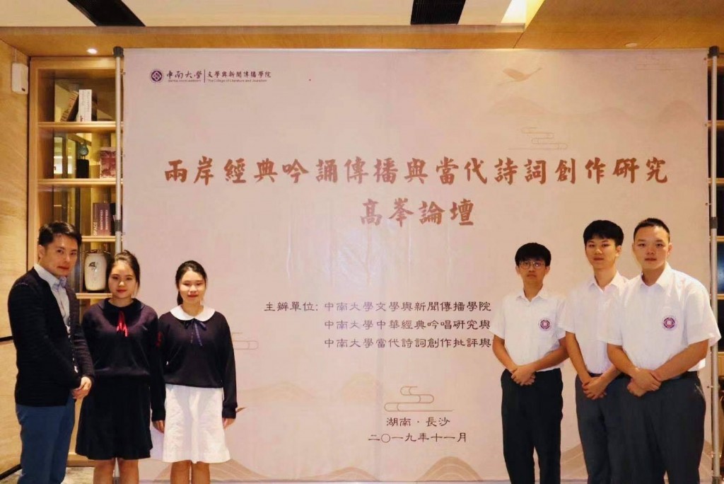 本校中學中文科張柏恩老師帶領高二正班5位同學於11月18-24日到湖南長沙參加由中南大學文學與新聞傳播學院主辦的首屆「兩岸經典吟誦傳播與當代詩詞創作研究」高峰論壇。來自澳門大學、台灣大學、北京大學等40多所高校的140餘名師生,30多家學術研究機構和社會團體的專家學者共同參加了此次高峰論壇。
