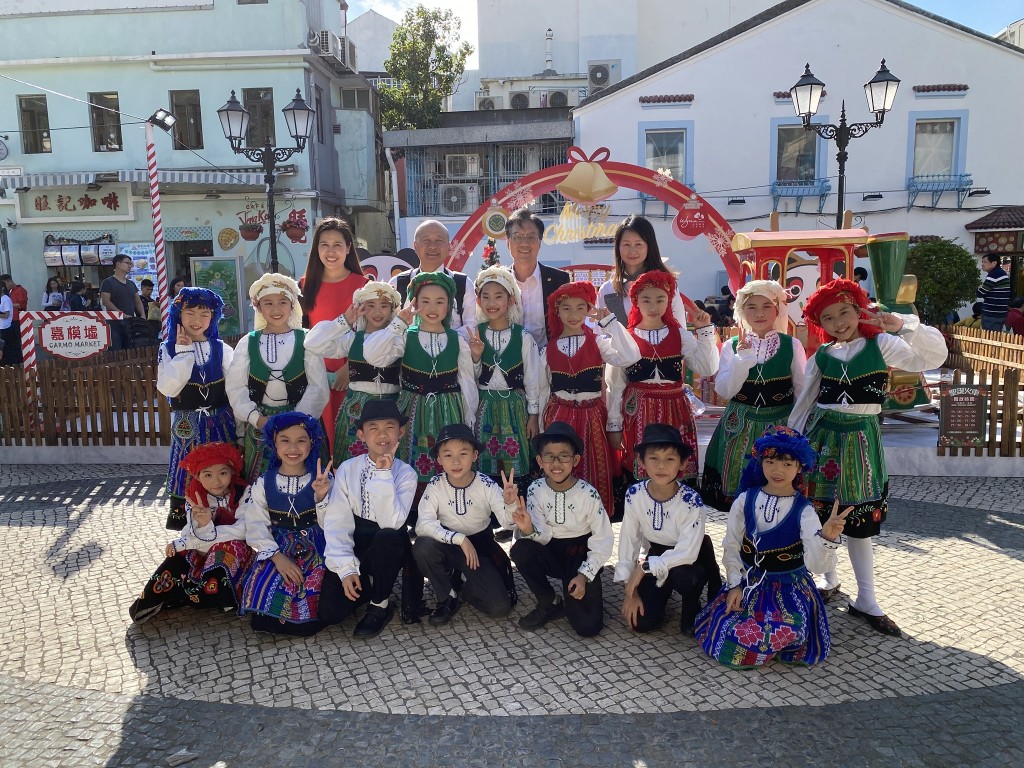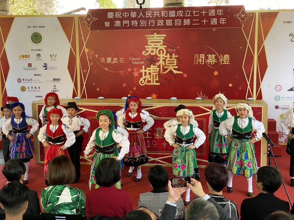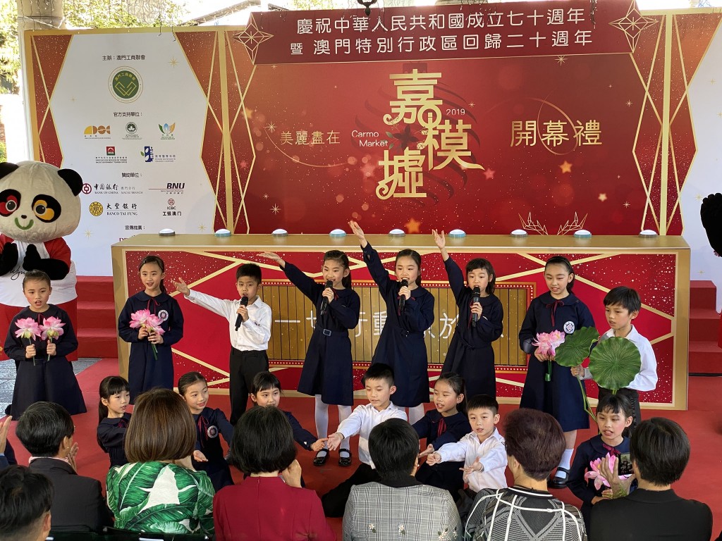 今天下午,小Sing星合唱團的16位團員受澳門工商聯會邀請,於氹仔舊城區嘉模墟參加“2019美麗盡在嘉模墟”開幕禮。活動中,小朋友們演出了具本土特色的葡語兒歌及土風舞,並為大家演唱澳門回歸祖國的主題曲《七子之歌》,壓軸節目由合唱團代表小四級同學沈靜柔與澳門歌手陳慧敏一起演唱《我和我的祖國》,將整個開幕典禮推向高潮。同學們精采的表演,可愛的表情,認真的態度,都獲得在場嘉賓及觀眾們一致好評。高錦輝校長及郭敬文副校長特別到場支持,對同學們的表現讚賞有嘉。