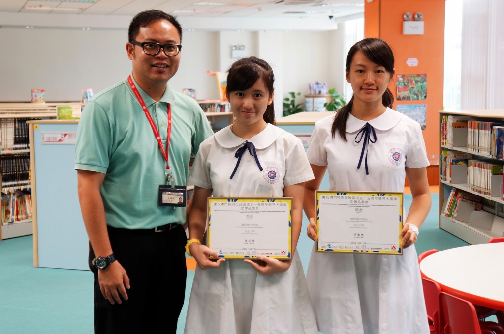 由教育暨青年局主辦、澳門中華教育會、澳門天主教學校聯會及澳門公職教育協會協辦之「慶祝澳門特別行政區成立十五周年學界大匯演」宣傳品創作徵集活動頒獎禮已於日前舉行。本校高二望陳采蓮及高二善胡凱琳均獲得優異獎,表現不俗。