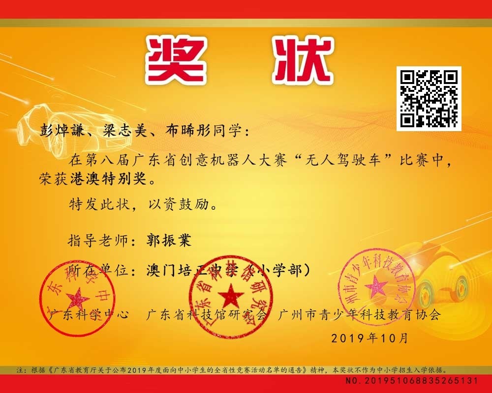 由廣東科學中舉辦之「2020廣東省創意機器人大賽」中,本校中學組學生古曉童、林俊翹、陳彥銘、麥家浩參加了「基礎組」中學組比賽。小學組梁志美彭焯謙、布晞彤參加了「基礎組」小學組比賽。本次比賽分為「基礎組」及「編程組」,「基礎組」是要求參賽學生根據比賽場地,組合一邏輯電路組成一臺可巡線行走之機械人,而「編程組」要求參賽學生為控制板編寫程式進行巡線。兩組學生皆在本次賽事中獲得「港澳特別獎」。
