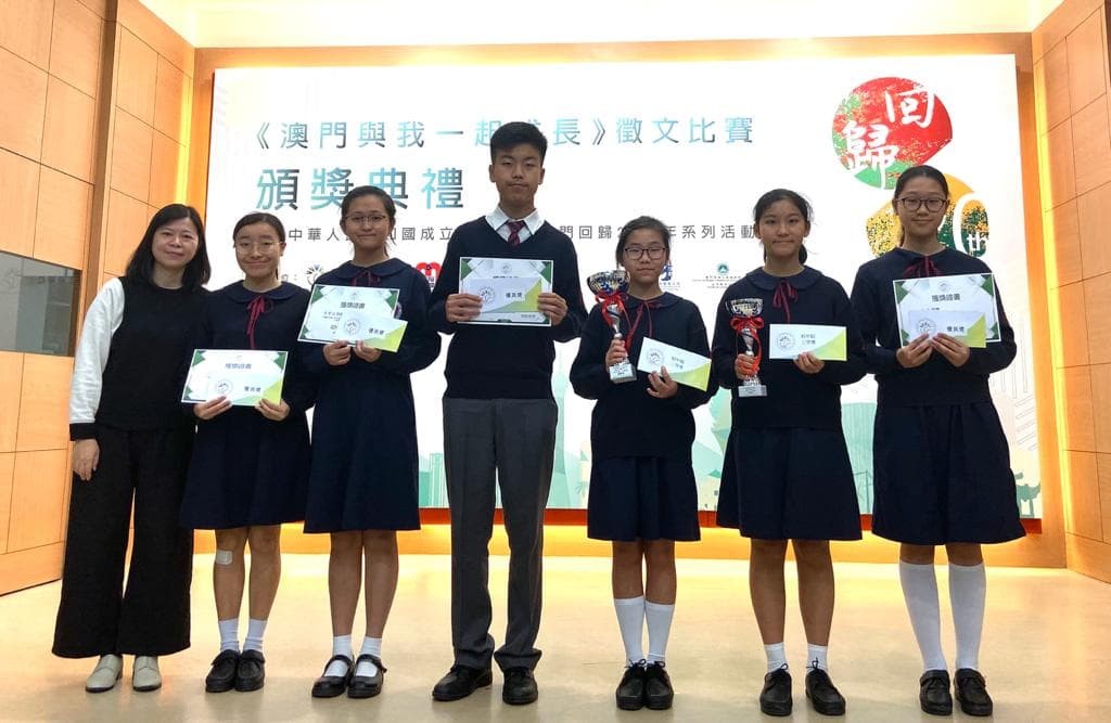 本校同學參加由澳門南海海外留學生聯盟主辦的「澳門與我一起成長」徵文比賽,獲取佳績。初二愛楊穎浠、江禧源分別獲初中組二等獎、三等獎;初二信黃璽諾、初二愛王明睿、初三信何曉晴獲初中組優異獎;高一望叢培羲、高三信何雅芷及羅榆姍、高三正勞詠芯獲高中組優異獎。