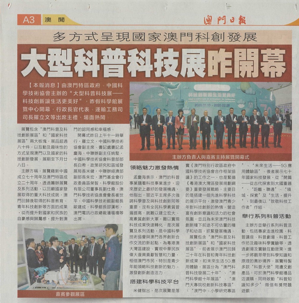 藉慶祝中華人民共和國成立70周年及澳門特別行政區成立20周年,由澳門特別行政區政府和中國科學技術協會主辦,由中國科學技術館、澳門科學館、澳門科學技術協進會承辦「大型科技科普展—科技創新讓生活更美好」之展覽和系列科普活動,我校有三份作品受邀參展,展示了我校幾年在國際及全國賽穫得的優異成果。