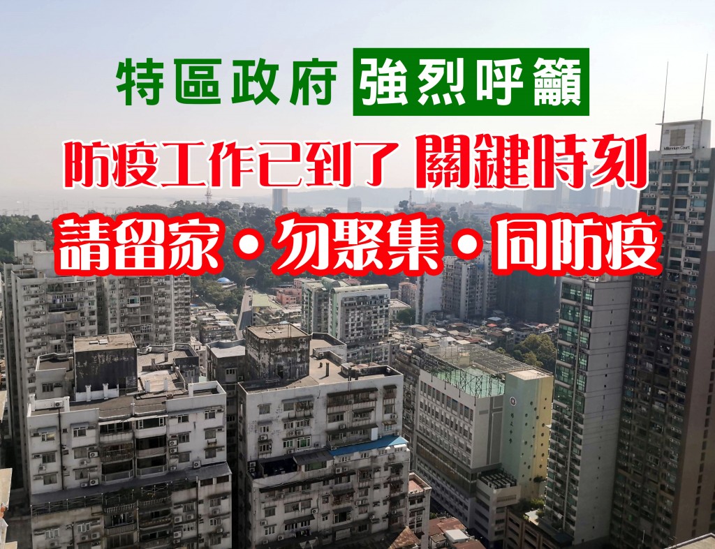 特區政府強烈呼籲:防疫工作已到了關鍵時刻,請留家,勿聚集,同防疫!