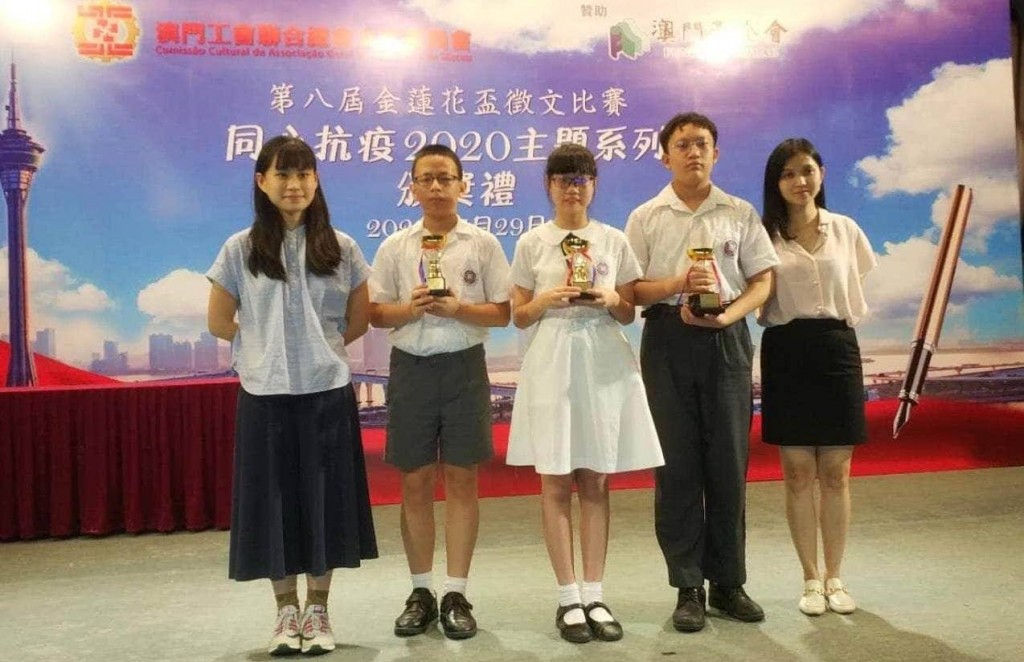 由澳門工會聯合總會文化委員會主辦的第八屆金蓮花盃徵文比賽,於今天下午舉行頒獎典禮。初二信高文駿獲優異獎,小五愛張祉萱、小六信吳宜霖、小六信陳鶴珣、初一正譚鎧宜均獲入圍獎。