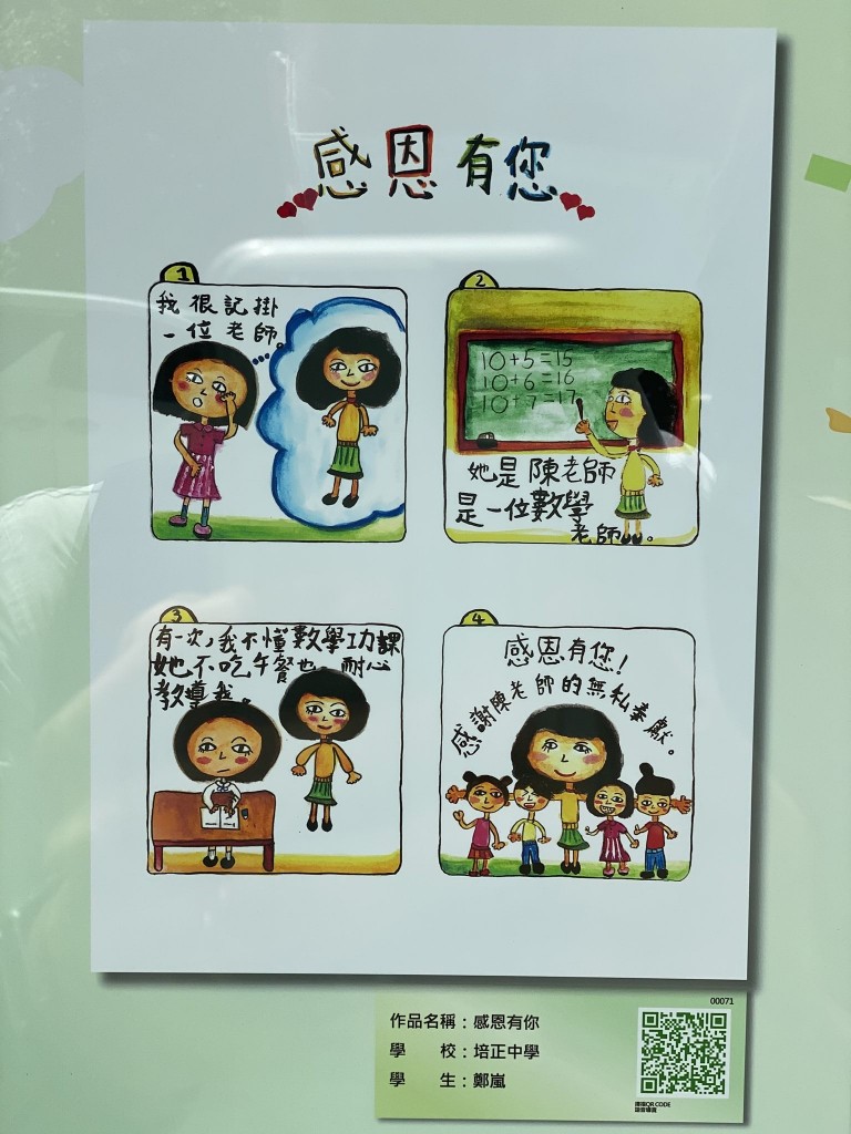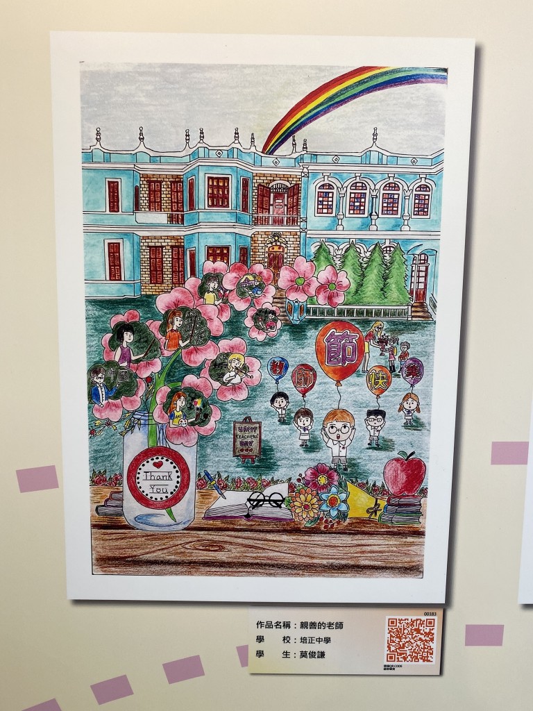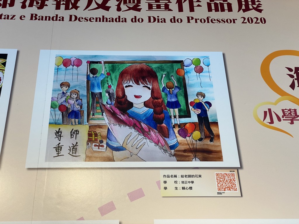 教青局主辦之2020教師節海報及漫畫作品展今天開幕,本校不少學生作品獲選參展。展覽主題是尊師重道,畫作傳達師生互愛關係,趁著教師節傳頌敬師愛師的訊息,展現學生感謝老師之情。該展覽由即日起至9月20日在教育資源中心子瞻廊舉行。