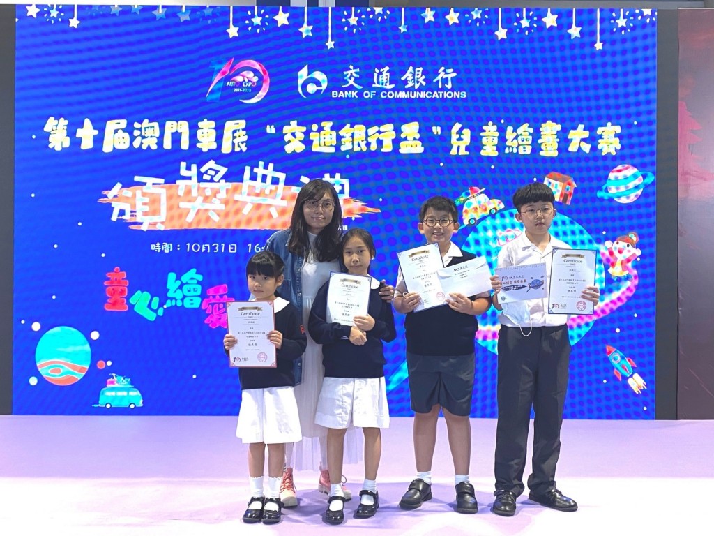 本校學生今天參加第十屆澳門車展“交通銀行盃”兒童繪畫大賽頒獎禮,是次比賽以“童心繪畫,築夢未來”為主題,旨在提升學生對日常交通的認識之外,同時觸發他們的創意,用繪畫繪出他們對未來交通工具的創新思維。