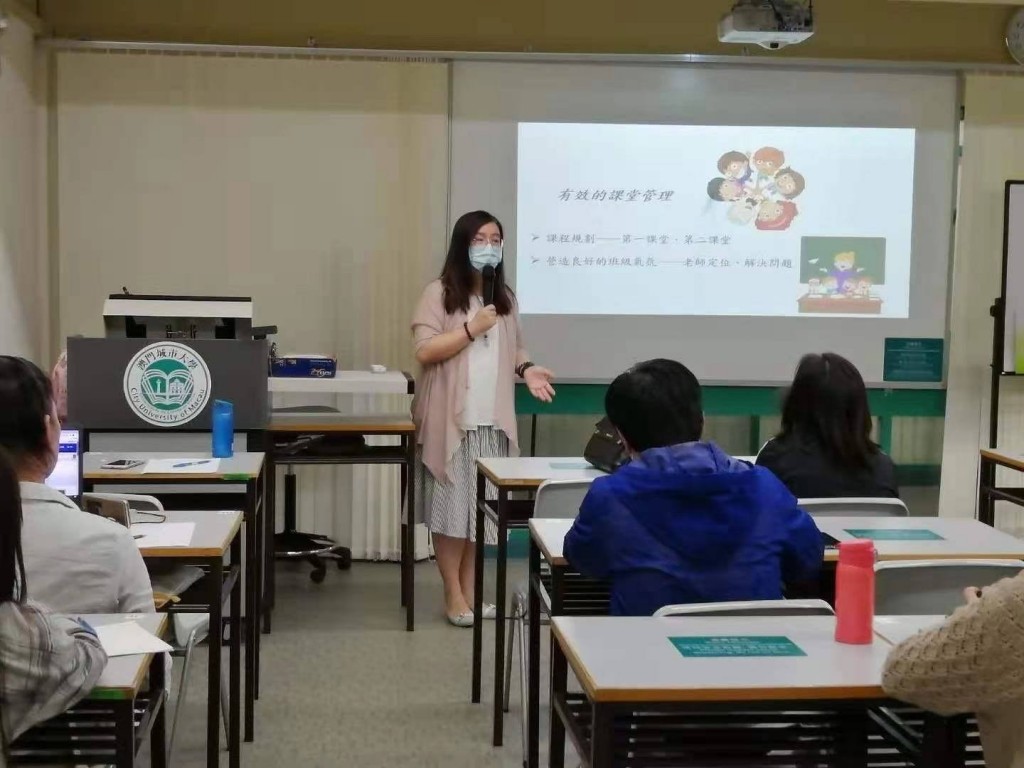 本校中學中文科副主任方秀娟老師應澳門城市大學邀請,今天下午與教學研究碩士一年級學生以「如何進行有效的課堂管理」為題作經驗交流,方老師以中文科課程改革、戲劇課程為切入點,分享了如何營造良好的班級氛圍和解決學生問題的策略,在場30多位前線同工積極發問,互動討論。
