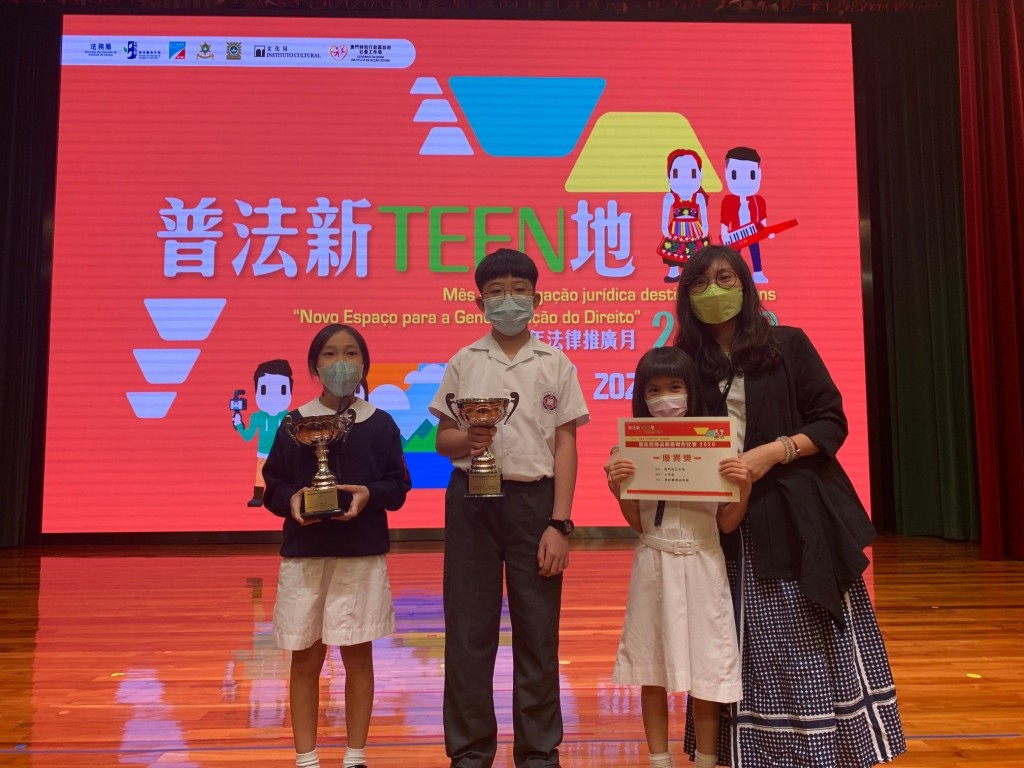 今天,本校學生參加“普法宣傳品創意製作比賽”頒奬禮,是次活動是法務局聯同教育暨青年局及治安警察局合辦,透過比賽讓青少年學生展示他們對法律的認識,並通過作品呈現出來,獲獎的項目分別是海報及圖文包設計。獲二等獎的同學是歐錦亮(小五)和邱語嫣(小三級),獲優異獎的同學是鄭曈(小一),以上獲奬同學的指導老師為黃慧儀。