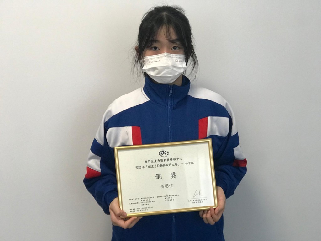 本次比賽在10月上旬,進行評審,11月公佈結果。本校初三光班高譽愷同學在本次過百件作品中脫穎而出,榮獲銅奬。今年比賽作品主題:中學組 ─「首飾盒」要求自行構思,以電腦3D軟件製作,並能配合主題設計出具創意、美感及實用的模型均能作為參賽作品。訓練對電腦3D建模及提升相關技能,讓學生在設計電腦3D物件得心應手。推動本澳創意產業發展,向世界電腦建模水平邁進;加強及鞏固本澳青少年設計3D物件之創意及塑模之技巧;提升本澳青少年對資訊科技的興趣;學習新知識,增強自信心。