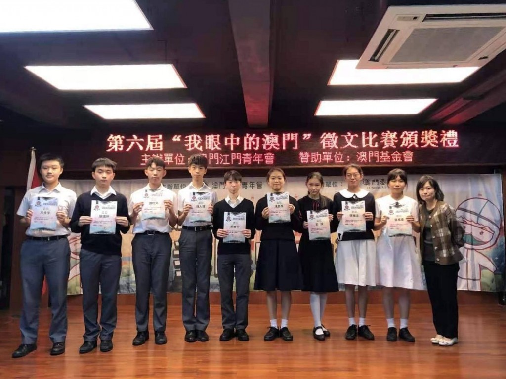 本校同學早前參加由澳門江門青年會主辦的第六屆「我眼中的澳門」徵文比賽,成績優秀。高一信張靖坪獲青年組一等獎,高二善張雅汶、張展柔獲青年組二等獎,高三愛張雅媛、高一愛方良宇獲青年組三等獎;初二信彭佳獲少年組一等獎,初三信馮嘉尚、初二信關文宇少年組二等獎,初三信譚貯文、初三望施人瑋獲少年組三等獎。