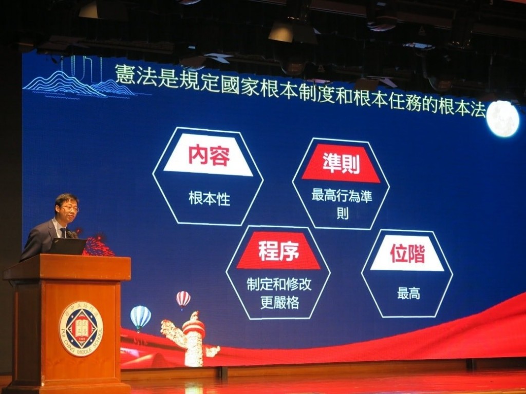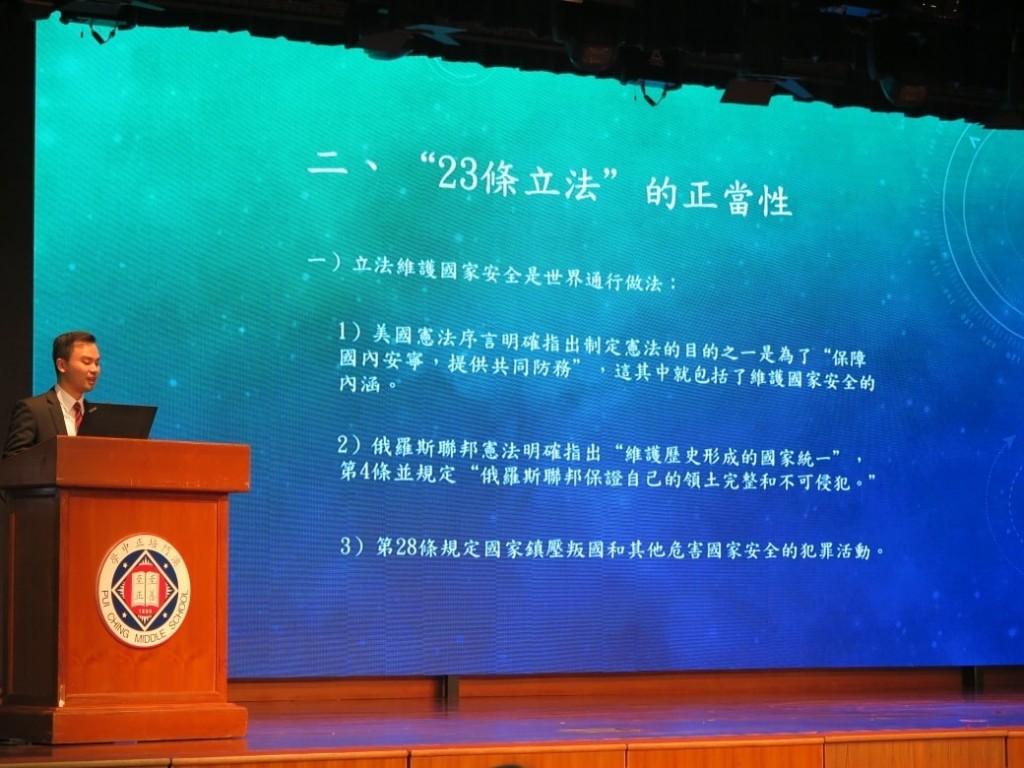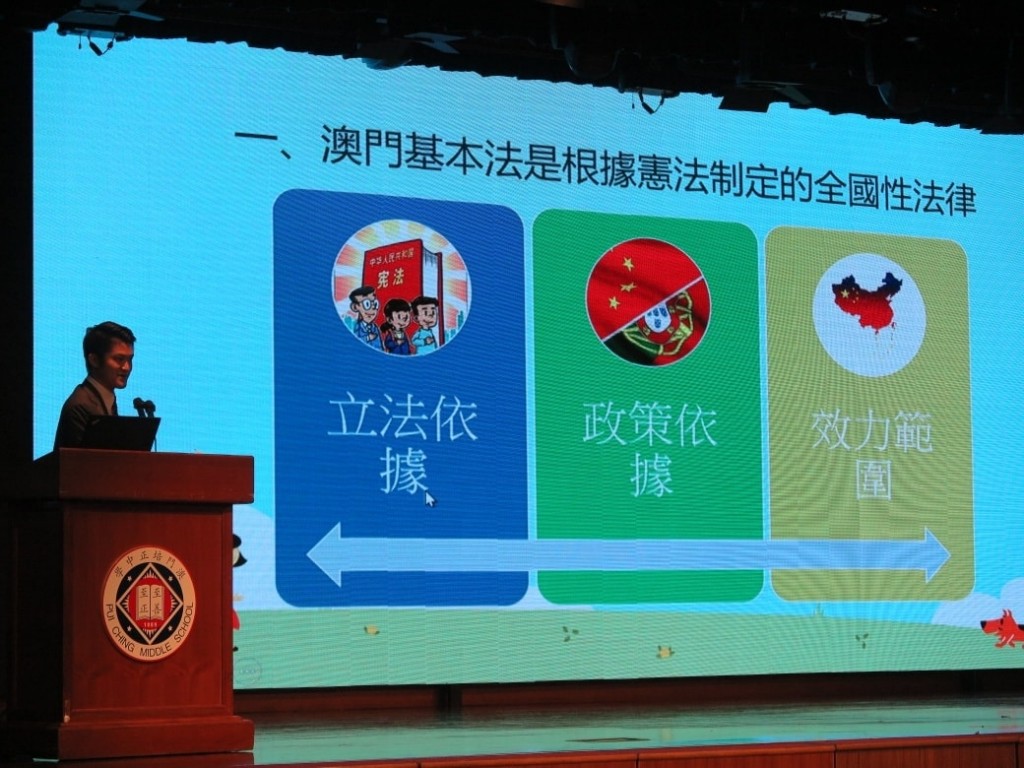 今天,澳門法律工作者聯合會的三位青年法律工作者,澳門科技大學法學院副教授兼任澳門法律工作者聯合會常務理事兼副秘書長沈雲樵博士、雄社學長黃景禧大律師以及希社學長崔天立大律師來到高二級的週會,帶來「青年法律工作者走進校園」計劃,讓我們有機會在校園認識憲法、基本法和法律,加強我們對相關內容的共鳴。