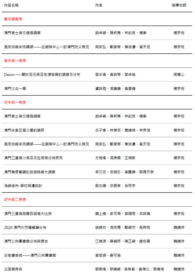 全國第十七屆(2020年)地圖展示活動評選結果出爐,同學經過田野調查結合環境意識、發揮地圖製作及使用技能後,於全國範圍中學作品中脫穎而出,獲得佳績如下: