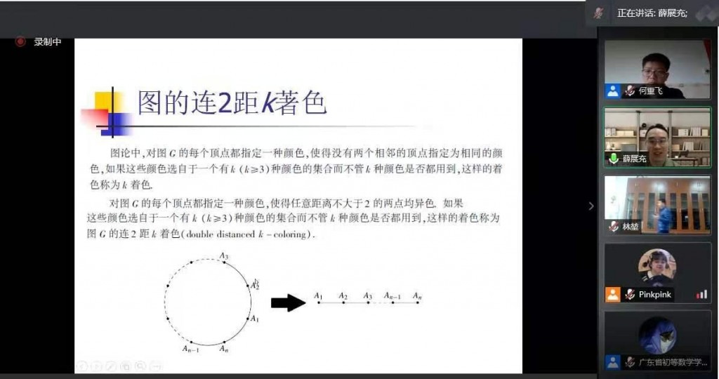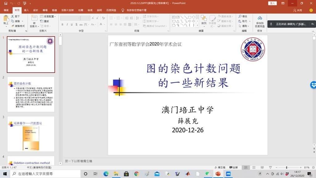 本校數學科薛展充老師今日參加廣東省初等數學學會第二屆理事會第四次會議暨2020年學術年會(線上會議),並應大會邀請作題為《圖的染色計數問題的一些新結果》的大會報告,獲與會者高度評價。