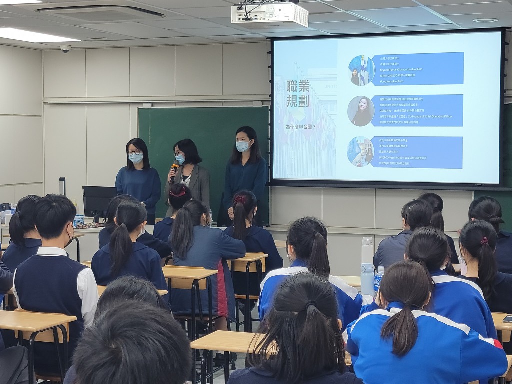 本校人文地理小組榮幸邀請到烏拉圭UNESCO科學人權員張可盈校友、UNESCO青年活動協調實習員黃幗瑜小姐、UNHCR難民營對外關係實習員暨現任聯合國大學澳門研究所客席研究助理袁斯陶小姐,三位卓越青年來校分享。三位嘉賓以聯合國框架、自薦信和面試技巧、如何進入聯合國體系、自身經驗分享等多角度切入,在座學生都獲益良多。