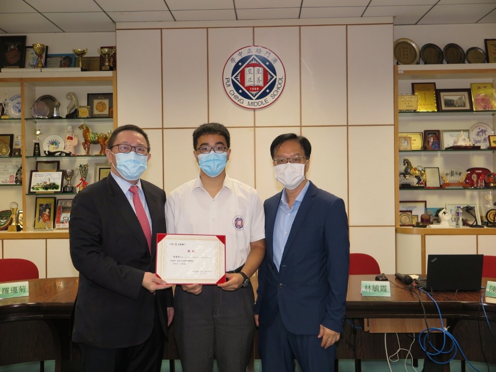 儀式上,高校長和工銀澳門陳錦聯副行政總裁一同頒發獲獎證書予獲獎同學。“工銀澳門基金獎”是為鼓勵長期參與商業知識競賽,以及即將到中國內地高等學府升讀金融、經濟等專業範疇的同學而設,獲獎同學有何梓為、何映霏、陳顥齊、李欣笑、蘇瑩芷、劉華睿、李靜然、黃文軒、鄭暉業和胡嘉葆。