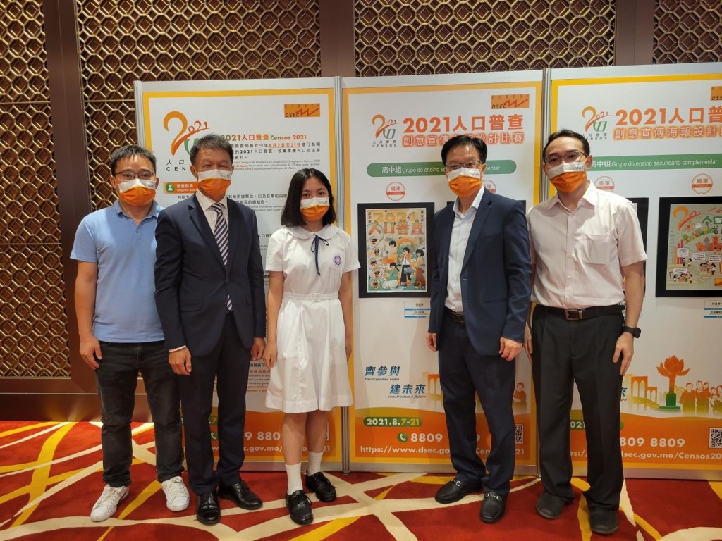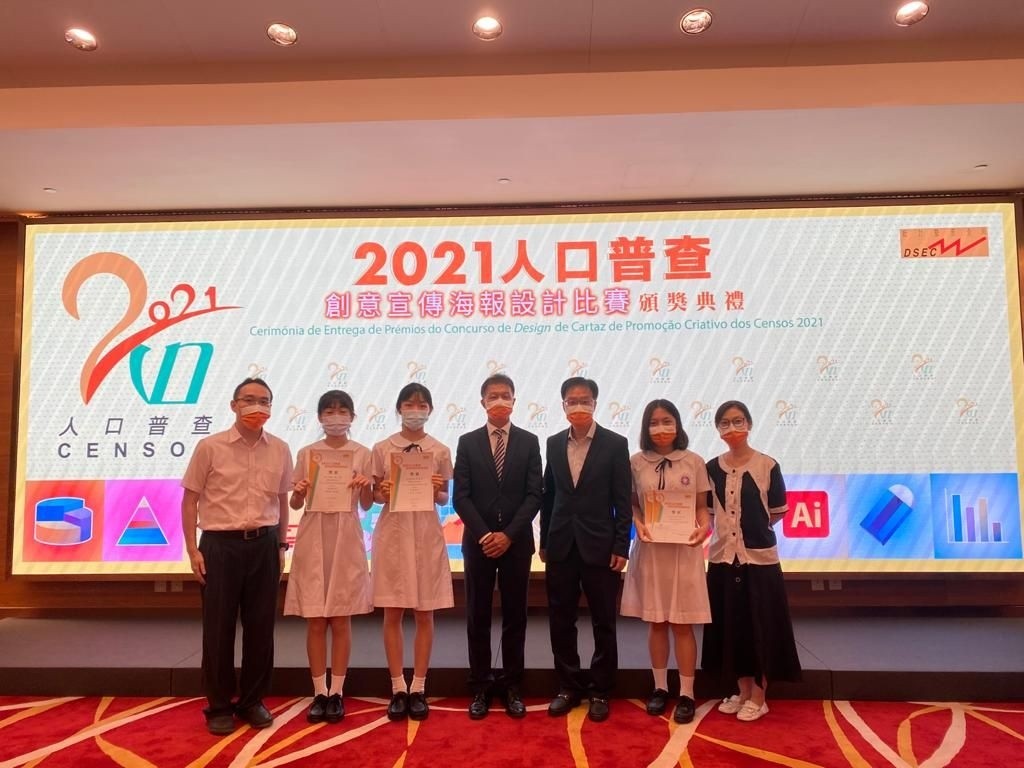 本校同學參加《2021人口普查創意宣傳海報設計比賽》,在全澳30間中學共628份作品中脫穎而出,其中高二愛胡凱琳獲高中組冠軍,高二善馮藹晴獲高中組優異獎,初三望高天瑜、麥嘉恩獲初中組殿軍。