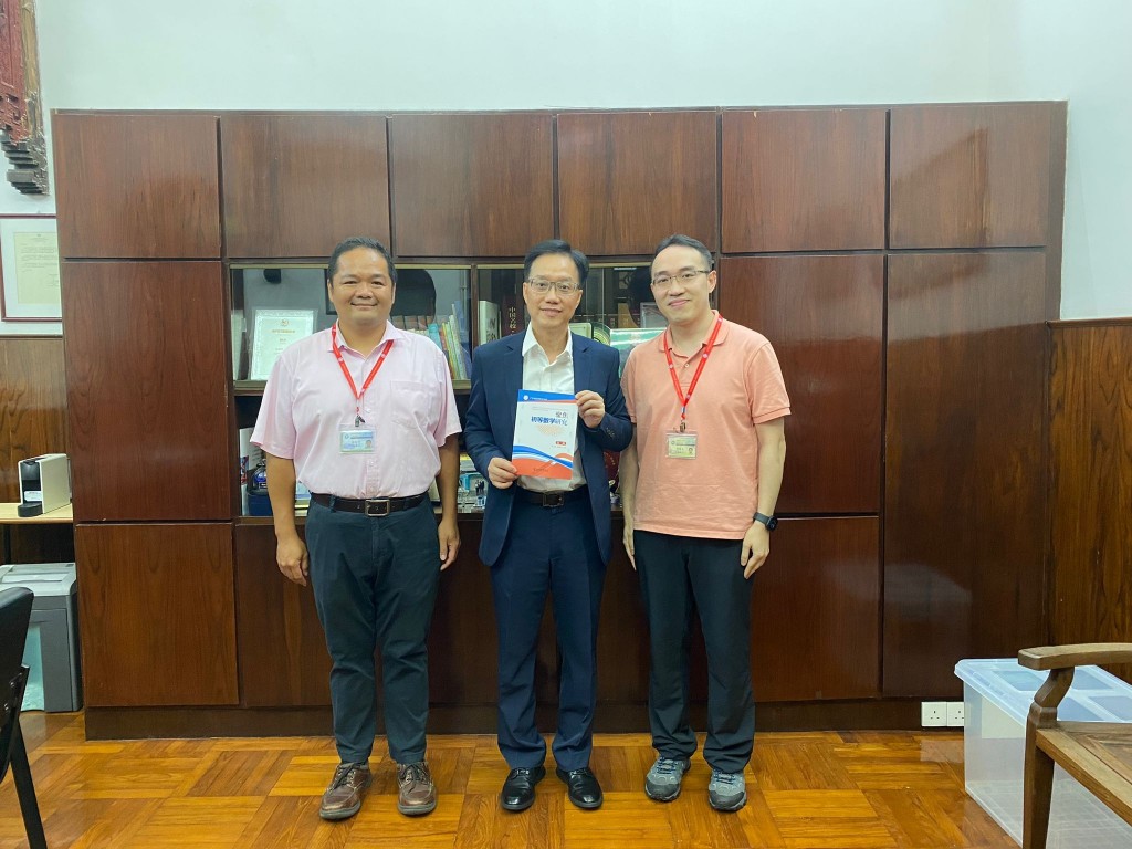本校數學科老師薛展充代表廣東省初等數學學會向校長高錦輝博士贈送該會最新出版的學術專著《聚焦初等數學(第二輯)》,數學科科主任胡俊明老師陪同出席。