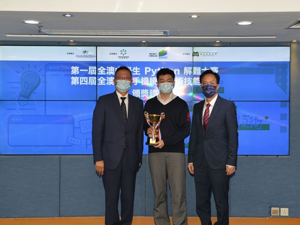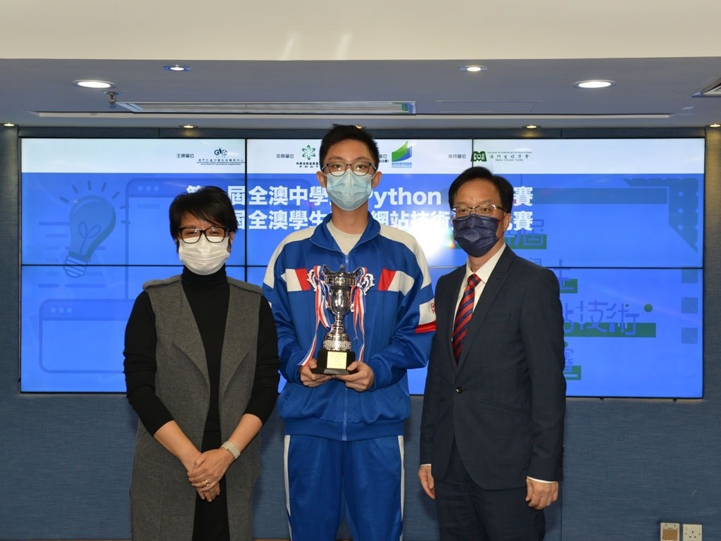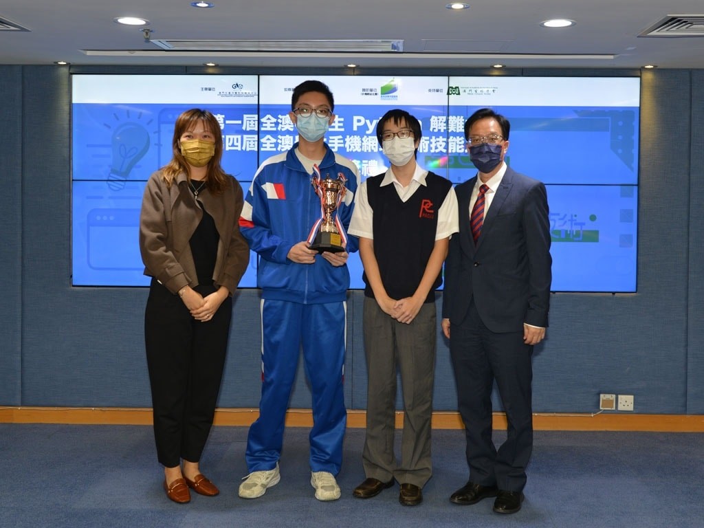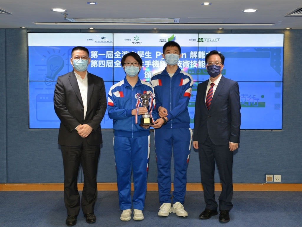 近年流行人工智能編程,Python 作為全民入門語言,更被納入內地信息技術考試學科之一。為了加強本地中學生程式設計能力,推動本澳資訊科技教育之普及、提升學生對程式設計的興趣,澳門生產力暨科技轉移中心主辦了第一屆全澳中學生Python解難大賽。是次比賽以二人一組的形式進行,成功吸引了九十多組學生參加比賽,本校亦組織了二十多組學生參加比賽。比賽分為初賽和決賽兩個階段,在決賽中有6道題目,共有40項評分項,超過100項檢查和5項行業準則評分。最後,由林秀蘭老師指導的高二級學生葉俊濠、黃天佑隊伍,榮獲得亞軍;由黃燦霖老師指導的高二級學生顏俊偉、許立知隊伍,則獲得季軍。