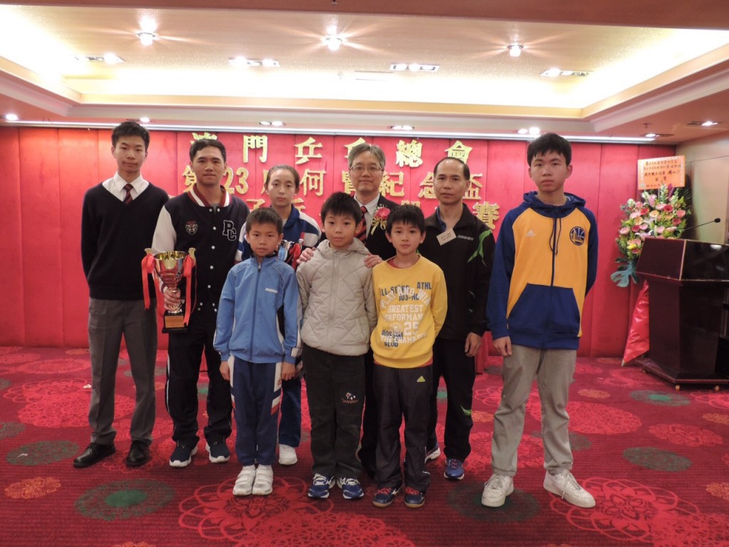 第23屆何賢紀念杯乒乓球賽頒獎禮,本校隊員合照。梁健華老師獲男子第一名,初一級陶昶同學獲女子第四名。