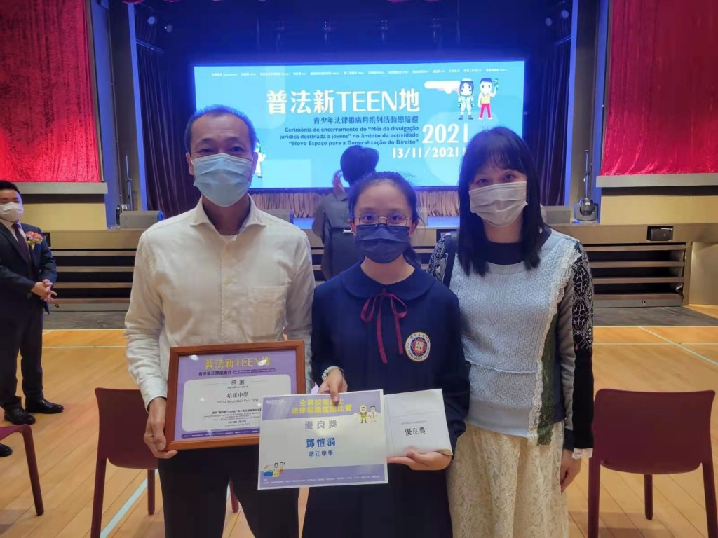 本校同學積極參與由法務局舉辦的“全澳校際網上法律知識闖關比賽”。此次比賽內容圍繞憲法與基本法、認識國家象徵、認識澳門法律制度、常見青少年犯罪、網絡欺凌和電腦犯罪、預防性犯罪等主題。經過一輪激烈比拼,初一正班鄧愷漪同學獲得優良獎。11月13日下午由德育處梁永棠主任及指導老師張海珊老師陪同出席頒獎禮。
