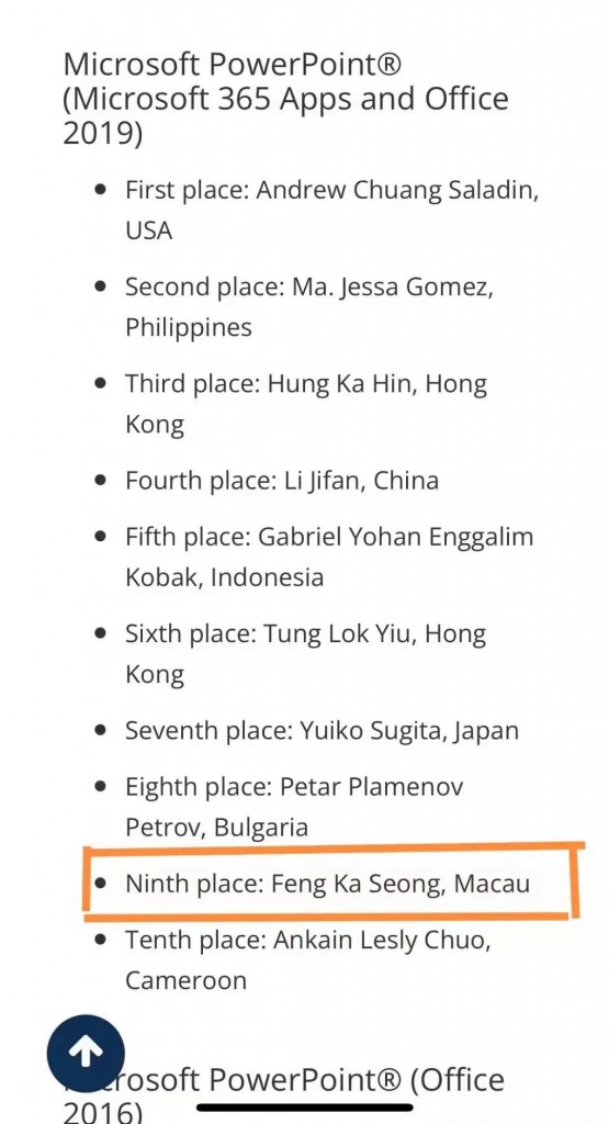 馮同學已於11月10日完成線上比賽,而頒獎典禮於11月15日晚上十時以線上形式進行。今年全新的題型,比賽時間增加至3.5小時,加入了VBA的編程部份。馮同學首次出賽參加PowerPoint2019項目,獲得全球排名第九的優異成績。