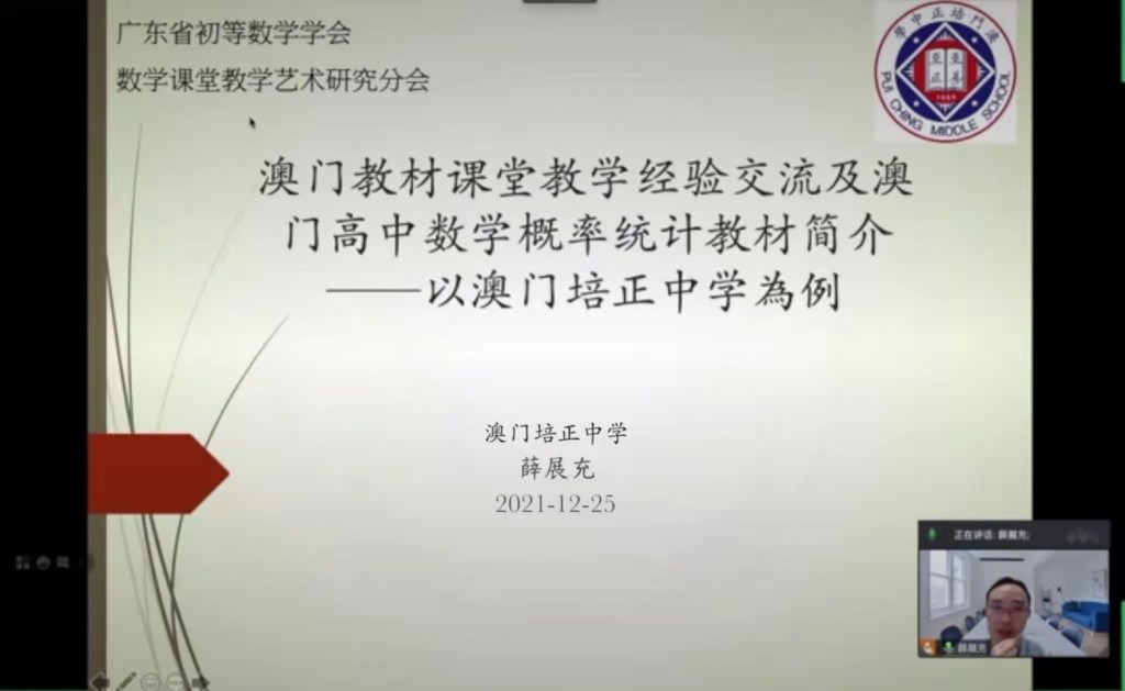 薛老師當天在線上作題為《澳門教材課堂教學經驗交流及澳門高中數學概率統計教材簡介——以澳門培正中學為例》的專題報告,與大灣區內數學教育工作者進行了深度交流,同時拓寬了與會者對本校中學數學教學情況的認識,收穫甚豐。