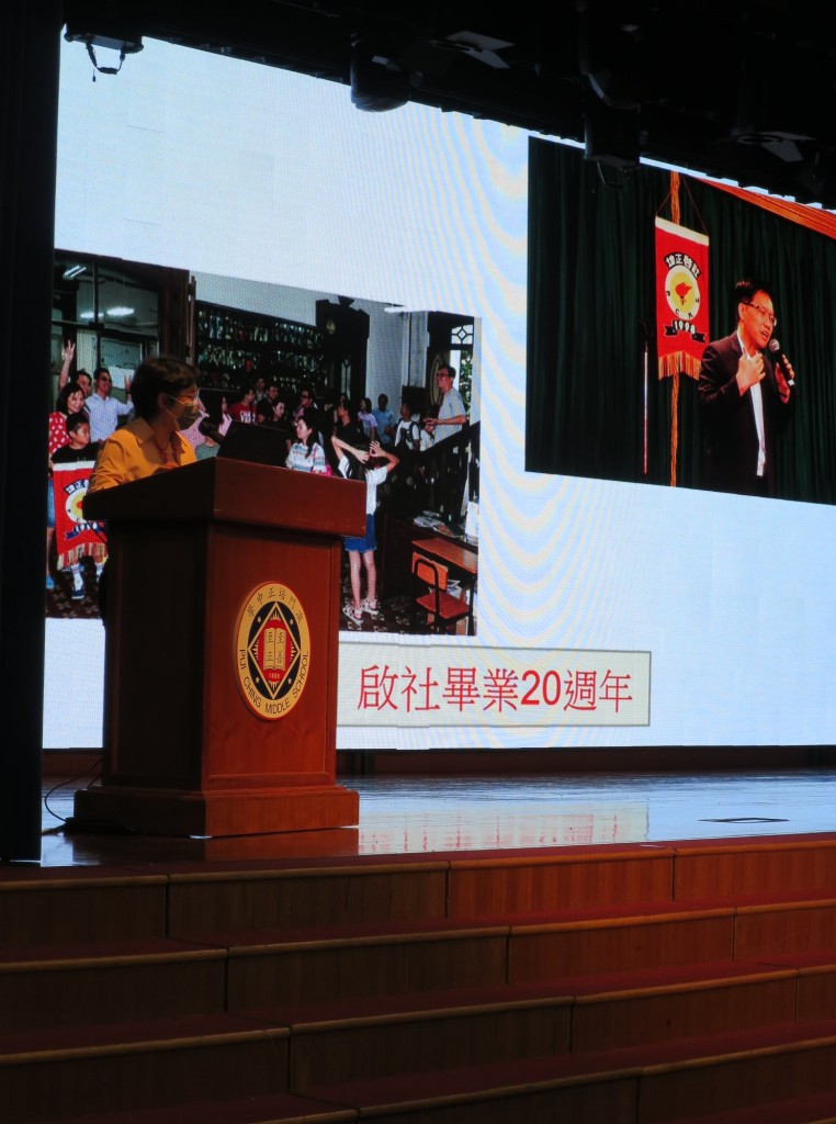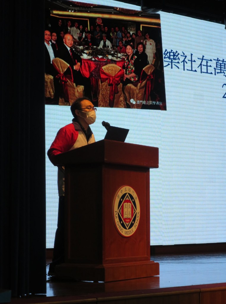 今日上午,澳門培正同學會黃漢堅會長到母校出席高三年級週會。會上,麥芷琪、郭艷玲、薛展充等校友老師介紹所屬各級社離校後所舉辦的聚會,分享當時師友共聚的喜悅。