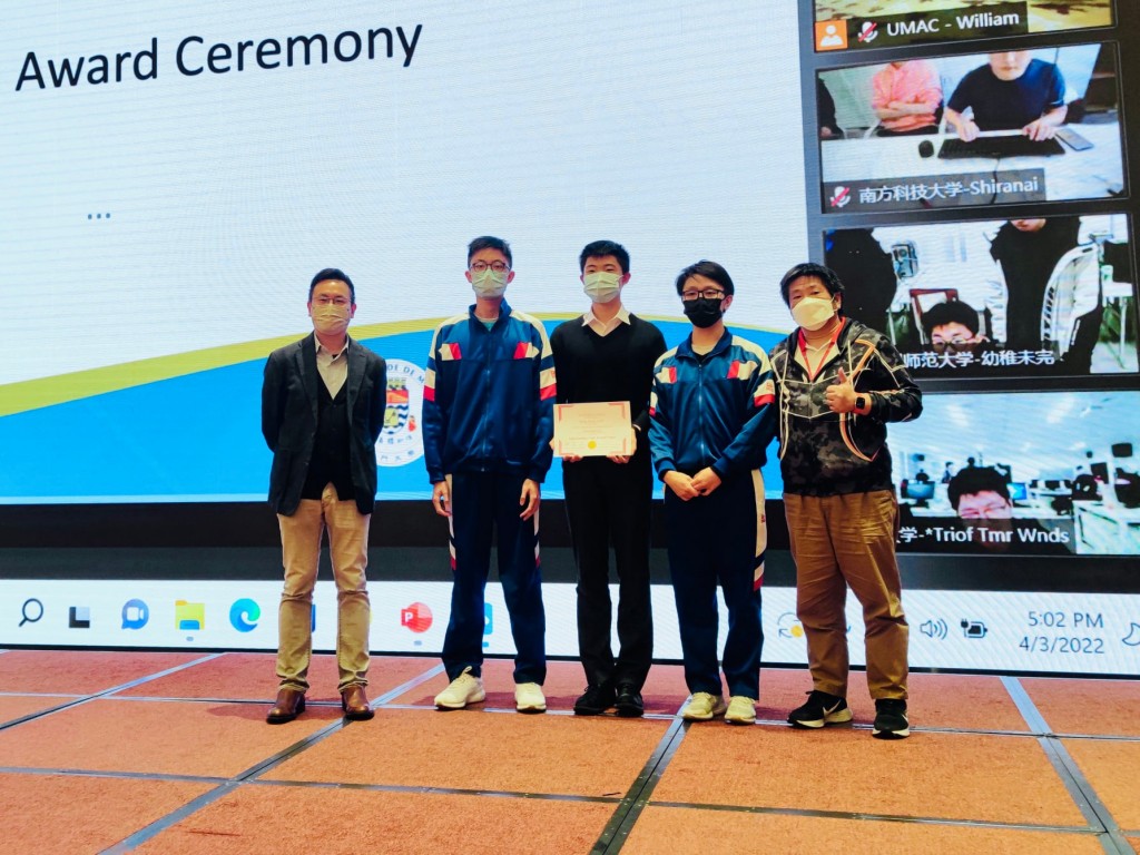 本校獲澳門大學邀請在 4月3日參加 The 2021/2022 ICPC Asia( International Collegiate Programming Contest / 國際大學生程式設計競賽 https://www.cis.um.edu.mo/icpc2022 ),本校派出8隊中、小學生(名單如下)參加 Outstanding High School Teams 組別,與大學生同場比試,各隊學生全力以赴,最後 T-one隊(葉俊濠、顏俊偉、黃天佑)憑著冷靜應戰獲得該組別中最高名次,為校爭光。