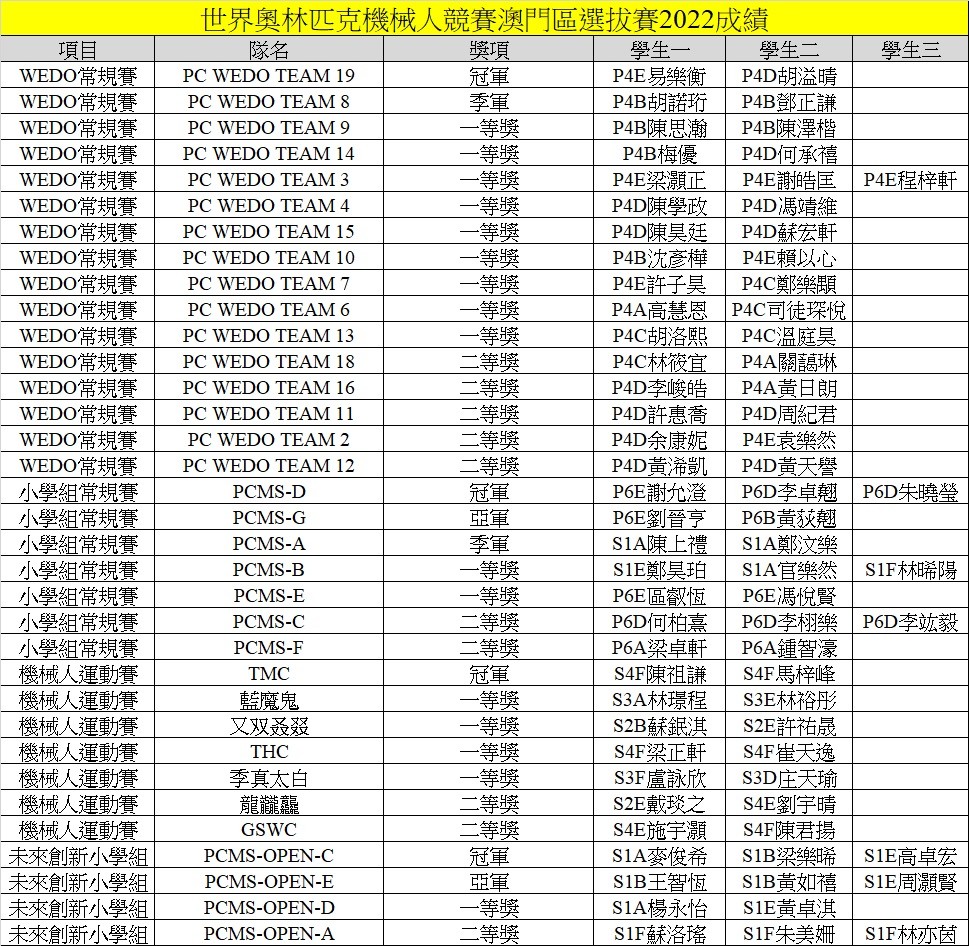 由澳門科技創新教育學會主辦的“二○二二WRO奧林匹克機器人競賽”澳門區選拔賽於11月20日舉行。比賽吸引全澳多所中小學學生參與。本校同學表現優秀,獲得了WEDO常規賽的冠軍及季軍、小學組,常規賽的冠軍、亞軍及季軍,機械人運動賽的冠軍,未來創新小學組的冠軍及亞軍,以及多項一等獎和二等獎,本校亦是全澳在此賽事獲奬最多的學校,展現出本校在推動STEM教育的成效。