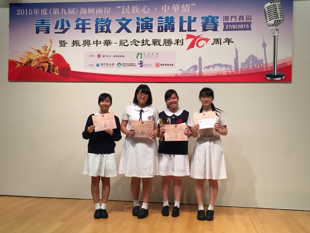 2015年度海峽兩岸“民族心、中華情”青少年徵文演講比賽(澳門賽區)於6月27日舉行。本校潘凌子同學獲季軍,譚依雯同學、唐樂臨同學獲鼓勵獎,程梓軒同學獲入選獎。