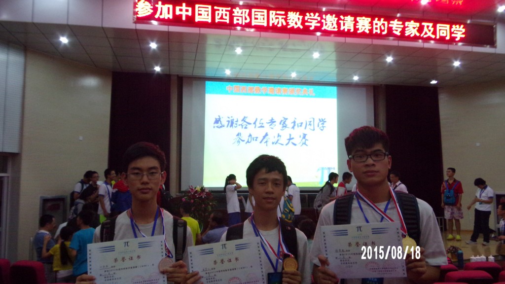 2015年中國西部數學邀請賽(CWMI)於8月14日至8月19日在寧夏銀川舉行,本校梅致常老師帶領三位高中同學參賽。是次比賽有來自北京、重慶、陝西、甘肅、廣西、貴州、江西、寧夏、青海、四川、新疆、雲南等17個省市、香港、澳門及新加坡、哈薩克斯等共24支代表隊181名青少年數學精英參加。