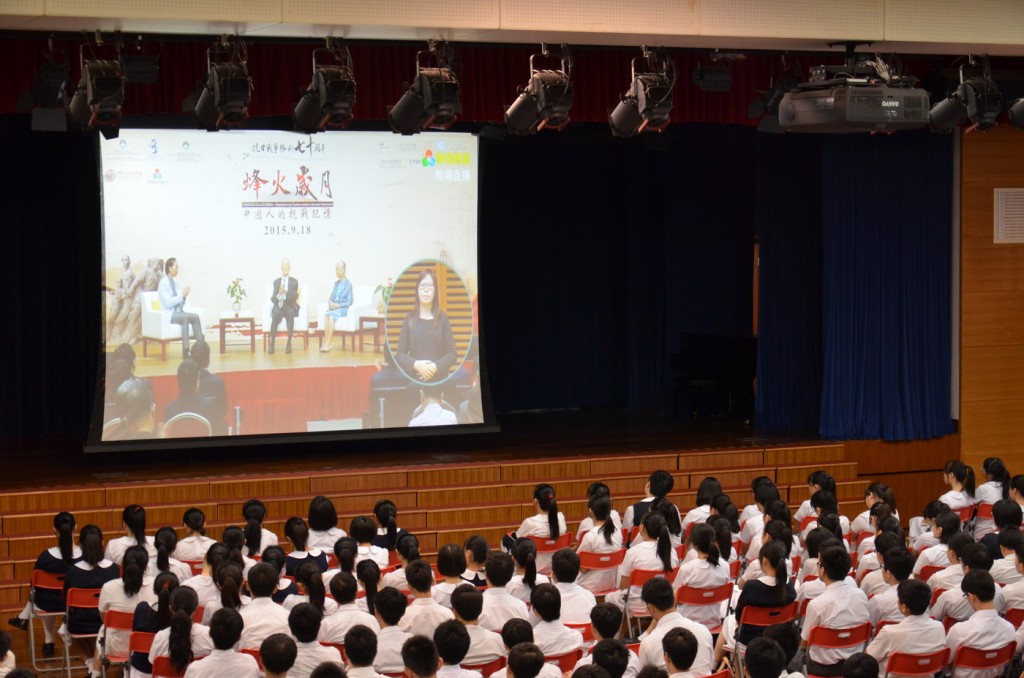 由澳門特別行政區政府社會文化司、教育暨青年局及高等教育輔助辦公室主辦的紀念抗日戰爭勝利七十周年《烽火歲月:中國人的抗戰記憶》,今早在澳門科學館會議廳舉行,特邀曾經歷抗戰的澳門人士李成俊和劉羨冰,分享戰爭時期的所見所聞,並透過照片回顧當年戰爭慘況。本校中學及高小學生在禮堂及課室觀看節目直播,認識歷史。