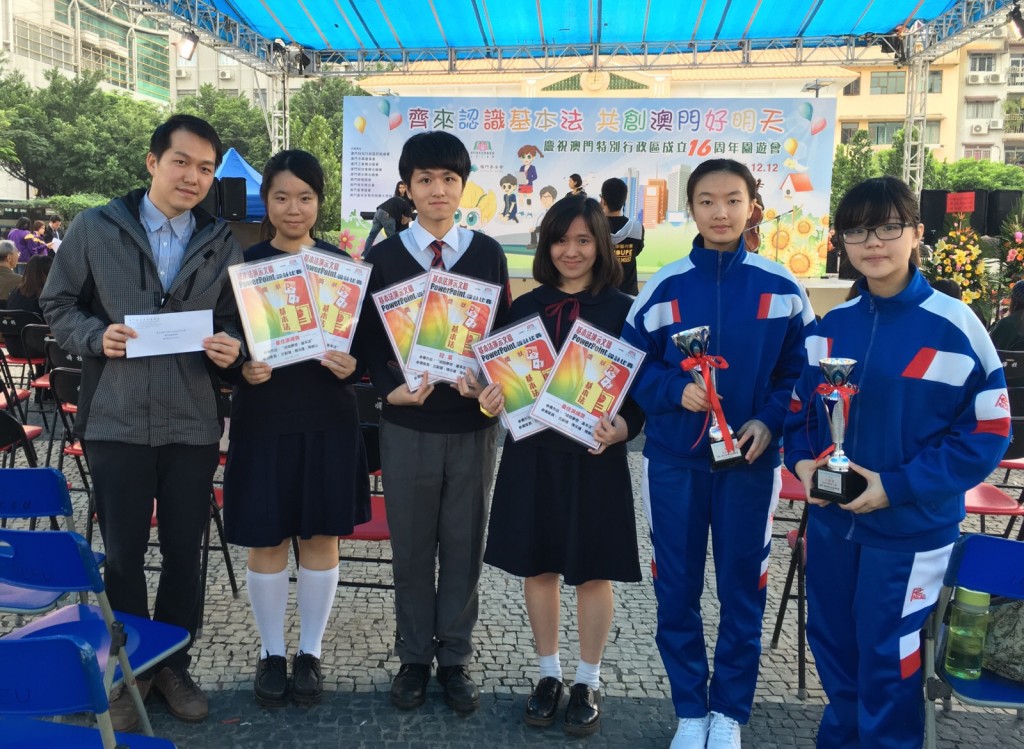 澳門基本法推廣協會主辦之“基本法演示文稿PowerPoint設計比賽”今午舉行頒獎禮,陳采蓮、丘蔚晴、陳崇山作品 “成就夢想.基本法” 獲冠軍及最佳演繹獎。同場,本校同學亦獲頒校園壁報設計比賽獎項。