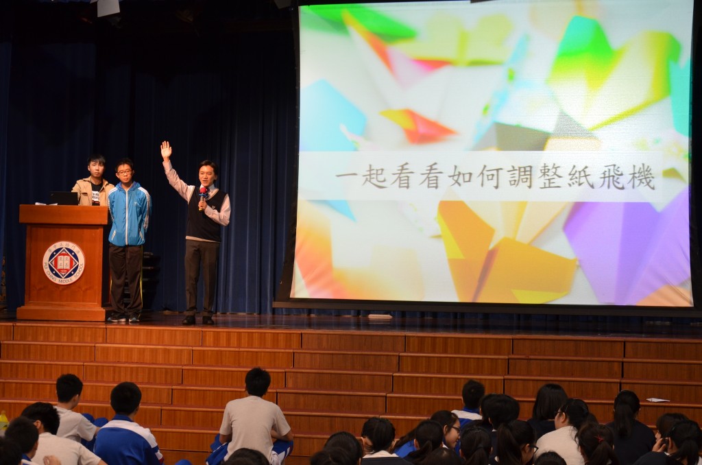 4月20日整個上午,初二級同學進行科學學習活動和競賽。期間邀請了澳門大學科技學院機電工程系劉承堅博士、世界紙飛機大賽最佳隊伍成員馬英同學、余樂健同學來校分享,向同學們介紹紙飛機的飛行原理,讓其見識到世界級選手的紙飛機飛行示範,有助修正自己製作的紙飛機並隨即進行比賽。