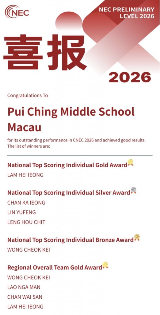 NEC全美經濟學挑戰賽(National Economics Challenge)是美國富有盛名、具有影響力的初高中生經濟學競賽。我校共有72位同學上月參加了全國初賽,超過30位同學獲得獎項。