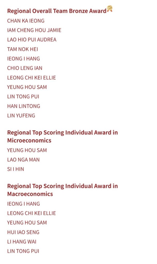 區域個人單科優勝榮譽(宏觀) 金獎