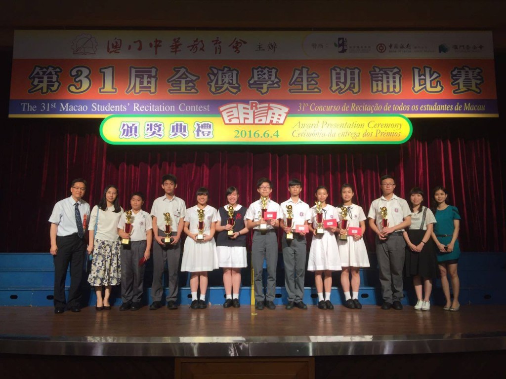 全澳學生朗誦比賽舉行頒獎禮,部分獲獎同學與校長、老師合照。