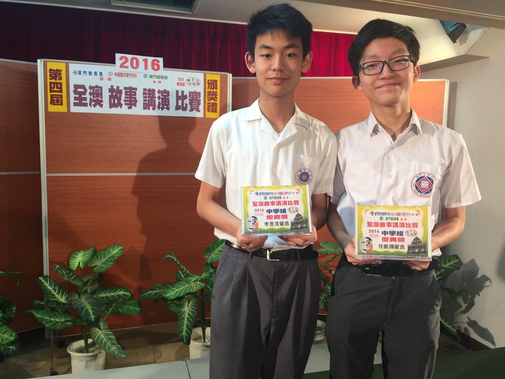 由澳門藝穗會主辦之「第四屆全澳故事講演比賽」,高一級任凱翎獲中學組優異獎,初三級李昱浩獲中學組優良獎,高二級唐樂臨獲中學組嘉許獎。頒獎禮上,任凱翎表演獲獎故事《狐假虎威》。