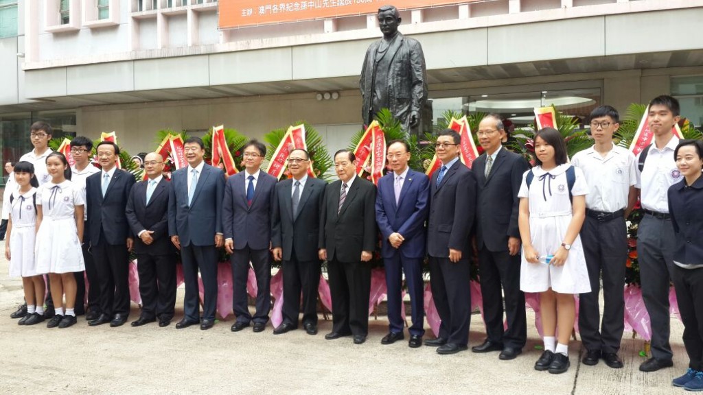 高校長今天帶領本校學生會代表參加「澳門各界紀念孫中山先生誕辰150周年暨辛亥革命105周年獻花儀式」,與部分主禮嘉賓合照。
