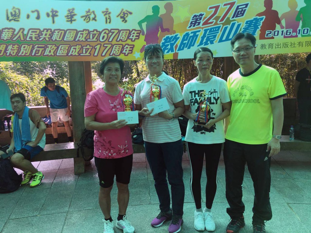 澳門中華教育會主辦之第27屆教師環山賽今早舉行,其中女子三組賽事,本校李瑞英老師、周谷華女士及榮休老師許雪萍分獲冠、亞、殿軍;男子三組比賽,梁永棠主任奪季軍。
