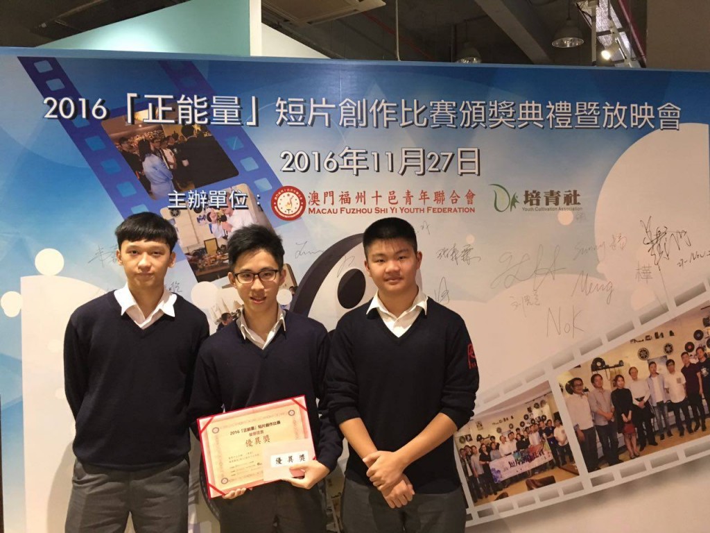 由澳門福州十邑青年聯合會及培青社舉辦的2016「正能量」短片創作比賽,於11月27日舉行頒獎典禮暨放映會,本校學生陸文瀚﹑黃志龍﹑陳孝弘獲得優異獎,其獲獎作品名稱為<<傳遞>>。