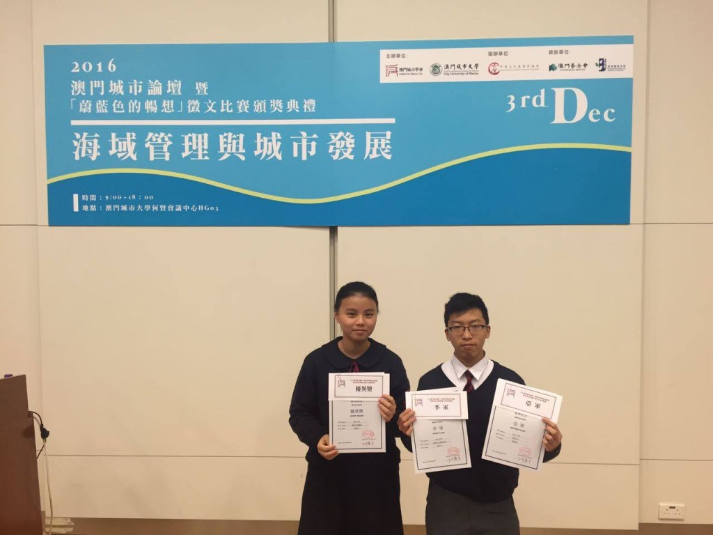 本校同學早前參加由澳門城市學會主辦的「蔚藍色的暢想」徵文比賽,喜獲佳績;高三正陳穎姿得亞軍,高一信黎卓杰得季軍,高二善林曉欣得優異獎。得獎同學獲邀出席12月3日上午在澳門城市大學舉行的「2016城市論壇──澳門海域管理與城市發展」,當中議題涉及海洋管理、規劃、考察,以及如何發展水域優勢等,引人深思。