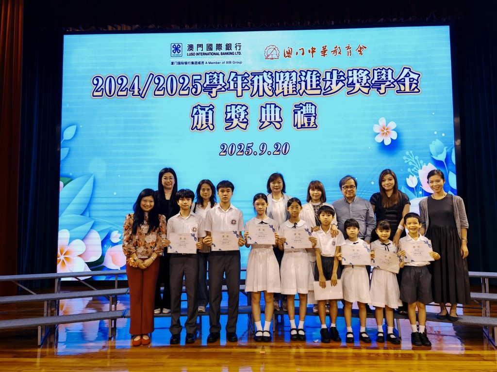 為促進本澳非高等教育階段學生的全面發展,澳門國際銀行設立了“飛躍進步獎學金”,用以獎勵澳門中華教育會團體會員學校中、小學教育階段每個年級的一名學生。“2024/2025學年飛躍進步獎學金”頒獎典禮已於今日上午十時在婦聯學校9樓禮堂舉行。